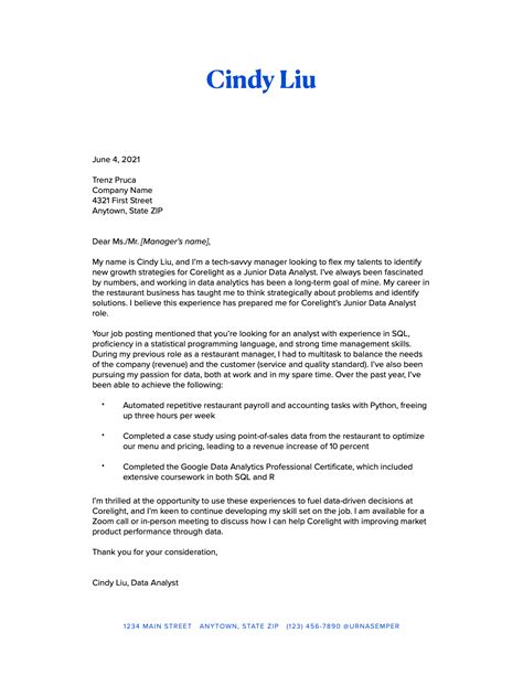 Before you hit send, proofread your cover letter carefully . Ask a friend or mentor to review it as well. Fresh eyes can catch mistakes you might have missed. Pay attention to grammar, spelling, and punctuation. Ensure that your cover letter is clear, concise, and easy to read. A polished cover letter demonstrates attention to detail and professionalism, which are important qualities for any data analyst.