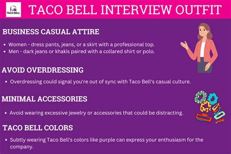 • Dress Appropriately: While Taco Bell has a casual atmosphere, it’s important to dress professionally for your interview. Wear clean and presentable clothing, such as a button-down shirt or blouse and dress pants or a skirt. Avoid wearing jeans, t-shirts, or athletic wear.