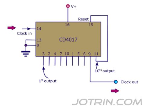 • Clock Input (CLK - Pin 14): This is where the magic begins! Every time you send a rising edge (going from LOW to HIGH) to this pin, the CD4017 advances to the next output state.