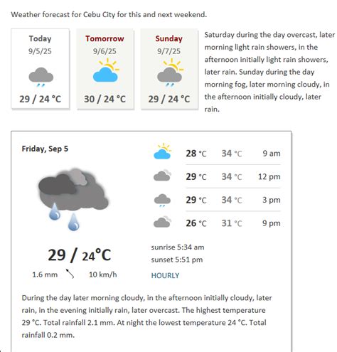 Okay, so you know what the weather is like right now , but what about later? Cebu’s weather can change pretty quickly, so it’s super helpful to have a sense of what the rest of the day might bring. According to the forecast, we can expect [Insert expected weather for the morning - e.g., the sun to continue shining with temperatures rising to 30°C]. By the afternoon, there’s a [Insert chance of rain - e.g., 30% chance of rain], so keep an eye on those clouds! As the evening approaches, [Insert expected weather for the evening - e.g., the weather should clear up with a cool breeze].