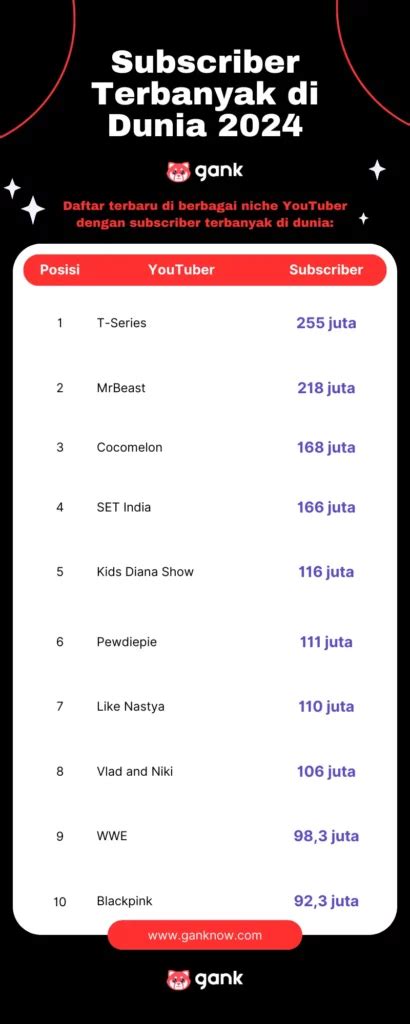 Di era digital yang serba connected ini, YouTube udah bukan cuma sekadar platform video biasa, guys. Udah jadi ladang emas buat para kreator buat nyalurin passion, berkreasi, dan tentunya, ngumpulin jutaan bahkan miliaran subscriber . Nah, buat kalian yang penasaran banget sama subscriber terbanyak di dunia 2024 , penting banget nih buat kita bedah bareng-bareng apa aja sih yang bikin channel-channel ini meledak? Mulai dari strategi konten yang out-of-the-box , konsistensi yang nggak main-main, sampai kemampuan mereka buat connect sama audiens di seluruh penjuru dunia. Ini bukan cuma soal video viral sesaat, tapi tentang membangun sebuah komunitas yang loyal dan terus berkembang. Kita bakal lihat gimana para raksasa ini nggak cuma ngasih hiburan, tapi juga edukasi, inspirasi, dan bahkan jadi bagian dari keseharian jutaan orang. Bayangin aja, punya audiens sebesar populasi beberapa negara! Gimana nggak gila tuh?