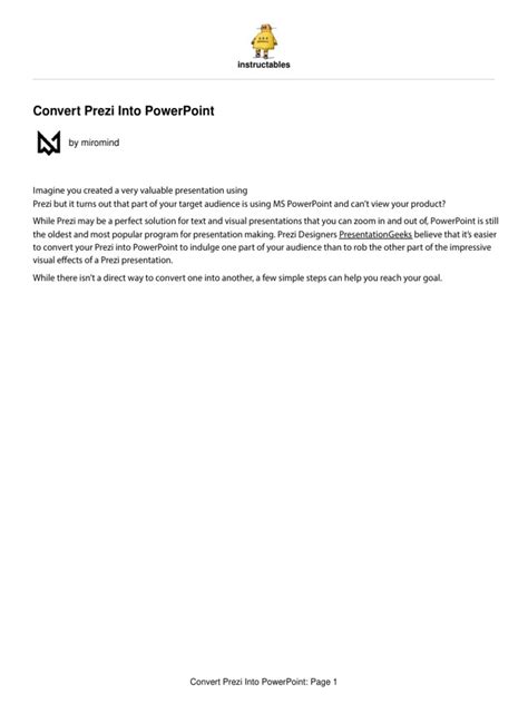 So, you’ve found a great online Prezi to PPT converter and you’re ready to make the switch. Awesome! But to make sure everything goes off without a hitch, here are a few pro tips, guys. First, prepare your Prezi beforehand . Before you even think about converting, go through your Prezi. Clean it up. Remove any unnecessary elements, animations, or images that might confuse the converter. Ensure your text is clear and well-organized within each ‘scene’ or frame. The cleaner your Prezi is, the better the conversion will likely be . Think of it as prepping your ingredients before cooking – it makes the final dish so much better! Second, choose the right export format from Prezi . As we touched upon, Prezi doesn’t usually export directly to .ppt. The most common route is exporting as a high-quality PDF. Make sure you select the best PDF export option available in Prezi to retain as much visual fidelity as possible. Third, understand the limitations . Remember, Prezi’s zooming and panning dynamic is fundamentally different from PowerPoint’s linear slide structure. Don’t expect a perfect, animated replica. The conversion will likely capture the content of each scene as a static slide. You’ll lose the flowy animations. Be prepared to potentially add some transition effects or manually recreate certain dynamic elements in PowerPoint if they are crucial. Fourth, preview and edit after conversion . This is super important , guys! Once you download your .ppt file, open it immediately in PowerPoint. Go through every single slide. Check for: * Layout issues: Are elements overlapping awkwardly? Is anything cut off? * Text formatting: Is the font still correct? Is the text editable, or is it an image? * Image quality: Are the images clear and high-resolution? * Content accuracy: Does each slide accurately represent the original Prezi scene? Be ready to make adjustments. You might need to resize images, reformat text, or reposition elements to make it look polished. Fifth, consider the purpose of the conversion . Are you just sharing static information, or do you need to maintain a sense of visual flow? If flow is critical, you might need to spend extra time in PowerPoint adding subtle animations or custom transitions to mimic the Prezi feel. If it’s just about getting the information across, a clean, static conversion might be perfectly fine. Sixth, test your converted file . If you’re presenting on a specific computer or platform, try opening the .ppt file on that system beforehand. Sometimes, there can be subtle differences in how software renders fonts or graphics. By following these steps, you can significantly improve the quality of your converted presentation and ensure it meets your needs effectively. It takes a little extra effort, but it’s worth it to have a professional-looking presentation in the format you require.