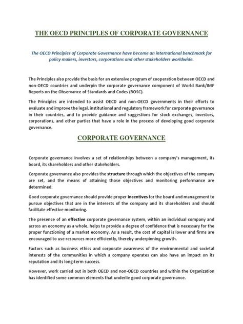 OECD menekankan bahwa sistem corporate governance yang kuat itu krusial banget. Kenapa? Karena ini bisa jadi jembatan antara perusahaan dengan pasar modal. Investor itu butuh kepastian, mereka mau tau uang mereka dikemanain dan gimana perusahaan itu dijalankan. Kalau tata kelolanya berantakan, ya siapa yang berani naruh duit? Makanya, corporate governance ini jadi semacam label kualitas buat perusahaan. Dengan adanya kerangka kerja yang jelas, semua pihak jadi punya panduan yang sama. Manajemen tahu tugasnya apa, dewan direksi tahu fungsinya ngawasin, pemegang saham tahu hak-haknya, dan bahkan karyawan pun punya panduan etis. Semua bergerak dalam satu irama yang harmonis demi kemajuan perusahaan.