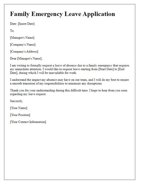 • State the Purpose: Clearly state that the letter is a request for family emergency leave.