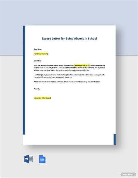 Start with a heading that includes your full name, address, phone number, and email address. This section allows the school to quickly and easily contact you if they need any clarification or further information. Make sure this information is accurate and up-to-date. Placing it at the top of the letter ensures it’s the first thing the recipient sees, saving them time and effort. This is your digital handshake, so make it count! Including all these details prevents any potential delays in communication, which is especially important if there are urgent matters to discuss regarding your child’s absence. For instance , if your child has a medical appointment and the school needs to confirm details, having your contact information readily available can expedite the process. So, always double-check that your heading is complete and accurate.