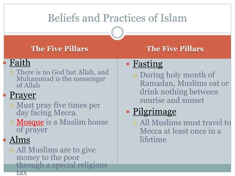 Okay, so we’ve got the core beliefs and the holy book covered. Now let’s talk about some of the practices that make up daily life for Muslims. These practices are all about putting faith into action and living in accordance with God’s will. Let’s see some of the most important things.