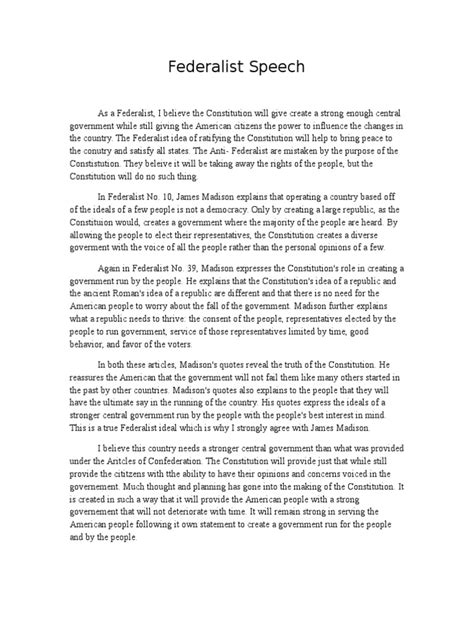 In conclusion, Jefferson’s Federalist Speech offers a valuable window into the mind of one of America’s most influential founding fathers. His ideas about liberty, limited government, states’ rights, and the agrarian ideal have shaped American political thought and continue to inform contemporary debates. By understanding his speech, we can gain a deeper appreciation of the complex and enduring legacy of Thomas Jefferson.