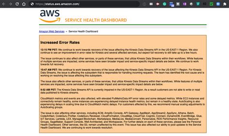 2. Check the AWS Service Health Dashboard: AWS provides a service health dashboard that will give you real-time information on any ongoing incidents that may be impacting Kinesis or any other service. This dashboard is your first point of reference to determine if the problem is a known AWS issue. If there is an outage on the dashboard, this might indicate the root cause. This information can save you time from troubleshooting your own infrastructure.