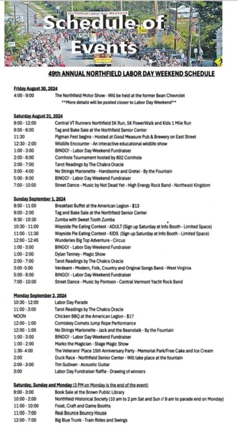 Hey guys, are you ready to celebrate Labor Day in Northfield, Vermont? If you’re looking for the Northfield VT Labor Day schedule 2025 , you’ve come to the right place! Labor Day weekend is always a fantastic time to enjoy our beautiful town, and this year is shaping up to be no exception. We’ve got all the inside scoop on the events, activities, and timings to help you plan your perfect long weekend. Whether you’re a local or planning a visit, get ready for some serious fun, relaxation, and a well-deserved break. Let’s dive into what makes Northfield’s Labor Day celebration so special!