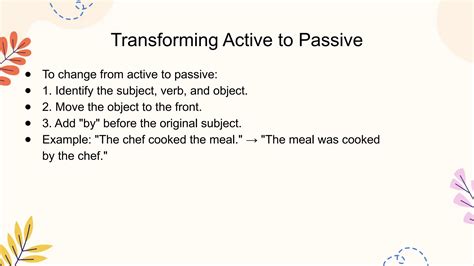 Okay, now for the fun part – actually changing “He cooked the food” to passive voice! We’re going to break it down into simple steps so you can see exactly how it works. First, we move the object (“the food”) to the subject position. This is like swapping the main characters in our story; the one who was acted upon now takes center stage. Next, we need to use the correct form of the verb “to be” (was/were) to match the tense of the original verb (“cooked,” which is past tense). So, we’ll use “was” because “the food” is singular. Think of “was” as the bridge connecting the old sentence to the new one, keeping the timing consistent. Then, we use the past participle of the original verb (“cooked”). Luckily for us, “cooked” stays the same in its past participle form! Finally, we add “by” followed by the original subject (“him”). This tells us who performed the action, even though the focus is now on the food. Putting it all together, we get: “The food was cooked by him.” See? Not so scary, right? Each step is logical and straightforward. By following these steps, you can confidently transform any active sentence into passive voice. It’s like learning a dance routine – each step builds on the previous one, and before you know it, you’re gliding across the dance floor (or, in this case, writing like a pro!).