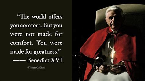 Faith and reason were central themes in Pope Benedict XVI’s teachings. He emphasized that faith and reason are not opposed but complementary paths to truth. One of his famous quotes highlights this: “The world promises you comfort, but you were not made for comfort. You were made for greatness.” This quote challenges us to rise above mediocrity and strive for higher ideals, blending faith and intellect in our pursuit of truth and purpose.