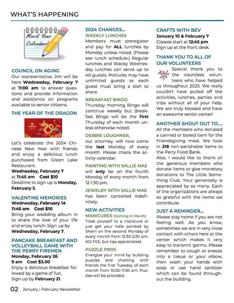 Alright, so what actually goes into a killer Pseigardnerse Senior Center Newsletter PDF ? You want to pack it with value, right? Let’s break down the essential ingredients. First and foremost, event listings are king. You need clear, concise details about what’s happening, when, and where. Include everything from bingo nights and potlucks to guest speakers and day trips. Don’t forget to add any necessary RSVP information or contact details for booking. Next up, program highlights . Is there a new art class starting? A successful fundraising drive? A group of seniors learning new tech skills? Shout it out! Highlighting these programs not only informs members but also serves as a great promotional tool. Health and wellness tips are also a massive hit. Think articles on healthy eating, simple exercises seniors can do at home, mental health advice, or information about local health screenings. This shows the center cares about the overall well-being of its members. Volunteer spotlights are another fantastic addition. Recognizing the folks who give their time and energy is a great way to show appreciation and encourage others to get involved. A “Member Spotlight” section can also add a personal touch, sharing stories and achievements of your members. Don’t shy away from important announcements . This could be anything from changes in operating hours, new staff introductions, or critical information about community services. Finally, consider adding a “Message from the Director” to provide a personal greeting and share the center’s vision. And, of course, make sure all contact information, including phone numbers, email addresses, and website links (if applicable), is prominently displayed. A well-rounded newsletter is informative, engaging, and reflects the vibrant spirit of the senior center.
