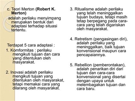 Jadi gini, Robert K. Merton mengembangkan teori anomie-nya yang terkenal itu. Anomie itu, singkatnya, kondisi di mana ada ketidaksesuaian antara tujuan budaya (kayak sukses materi) sama cara yang sah buat mencapainya. Nah, dari teori anomie ini, Merton mengidentifikasi lima tipe adaptasi individu terhadap kondisi anomie tersebut. Kelima tipe itu adalah konformitas, inovasi, ritualisme, pengasingan diri (rebellio n), dan akhirnya, inovasi.