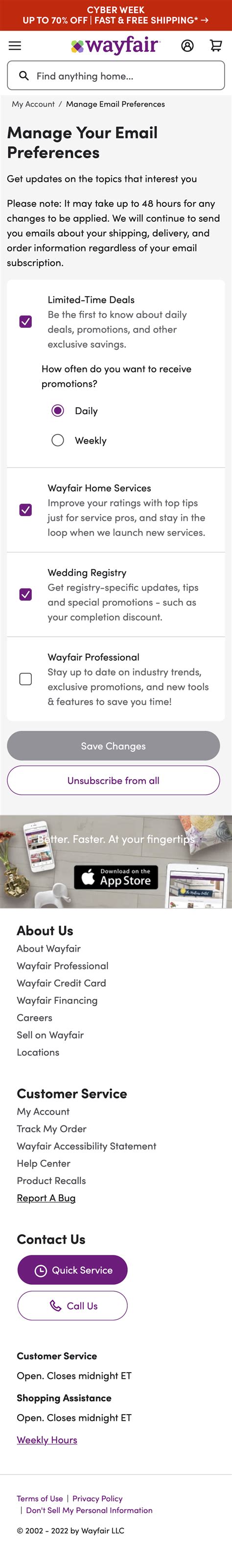 If you cannot find the unsubscribe link, try checking the email’s footer or contacting Wayfair’s customer service for assistance. The link is always there, so just have a good look.