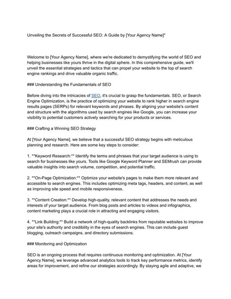 • On-Page Optimization : This involves optimizing the content and structure of your website to improve its relevance to search engines. This includes things like using your target keywords in your page titles, headings, and body content; optimizing your images with descriptive alt text; and ensuring your website is easy to navigate. Think of it as making sure your website is clear, concise, and user-friendly. Google wants to provide the best possible experience for its users, so it rewards websites that are well-organized and easy to understand. Make sure each page has a clear title tag, the main headline is an H1, and the subsequent headings are correctly structured with H2s, H3s, etc. Use your target keywords naturally throughout your content, but avoid keyword stuffing – it’s a big no-no! Make sure you provide valuable, original content that solves your user’s problems or answers their questions.